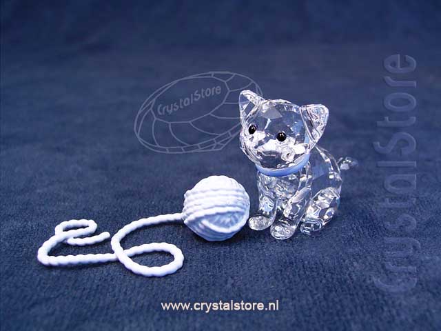 This little kitten wants to play with you! Sparkling in clear crystal, with a light blue plastic collar and a bun wool of light metal. Create a fun family of three by combining it with the Mother Cat and Kitten standing.